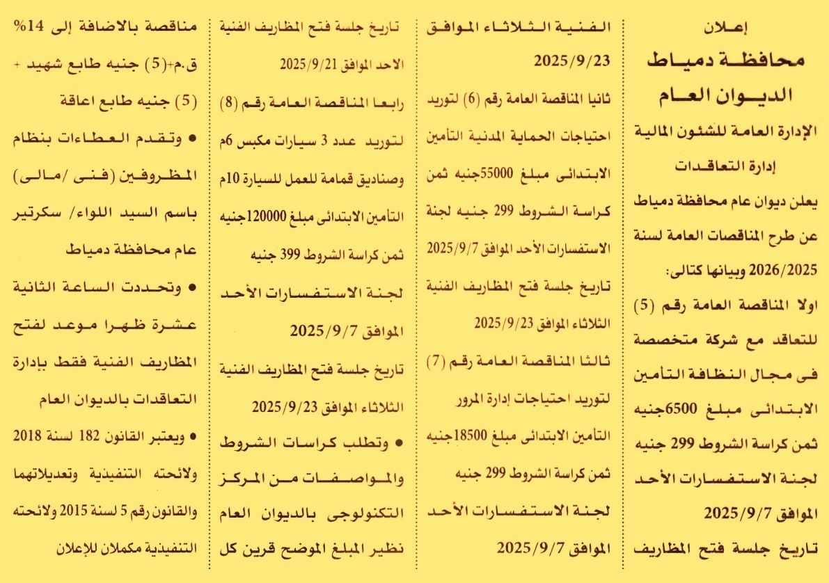 HOT Information مناقصة عامة رقم 5/2025/2026 لعملية تنفيذ أعمال النظافة (جلسة الاستفسارات يوم 7/9/2025) عن جريدة الأهرام Post navigation مؤسسة شفاء الاورمان الادارة المركزية لشئون محطات البحوث والتجارب الزراعية