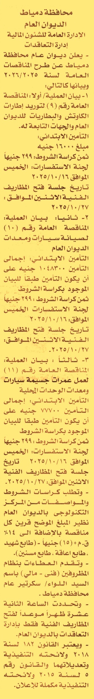 HOT Information مناقصة عامة رقم 9/2025/2026 لعملية توريد إطارات الكاوتش والبطاريات للديوان العام والجهات التابعة له (جلسة الاستفسارات يوم 16/10/2025) عن جريدة الأخبار Post navigation الجمعية المشتركة للإصلاح الزراعي منطقة كفر الشيخ محافظة أسيوط