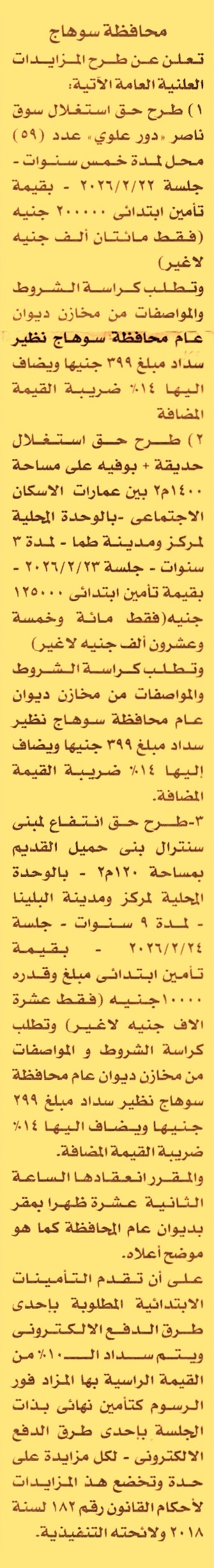 HOT Information مزايدة علنية عامة لعملية حق استغلال سوق ناصر “دور علوي” عدد 59 محل لمدة 5 سنوات عن جريدة الأخبار Post navigation محافظة الدقهلية الوحدة المحلية لمركز ومدينة اطسا