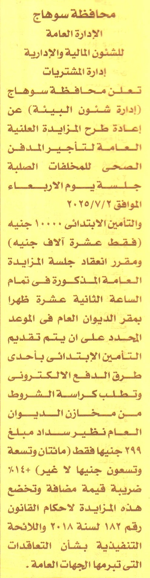 HOT Information إعادة مزايدة علنية عامة لعملية تأجير المدفن الصحي للمخلفات الصلبة عن جريدة الأخبار Post navigation الهيئة العامة للنظافة والتجميل شركة مطاحن ومخابز شمال القاهرة