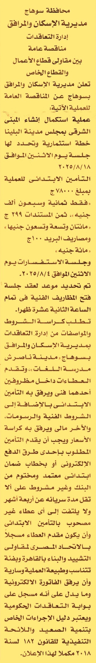 HOT Information مناقصة عامة لعملية إنشاء المبنى الشرقي بمجلس مدينة البلينا (جلسة الاستفسارات يوم 4/8/2025 ومدة سريان خطاب الضمان 4 أشهر) عن جريدة الأخبار Post navigation رئاسة مركز ومدينة أبو حماد الوحدة المحلية لمدينة السباعية