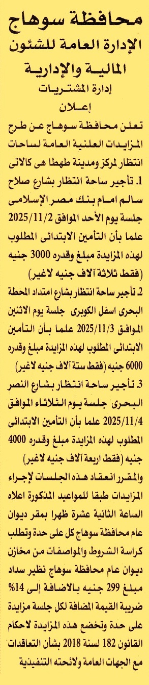 HOT information مزايدة علنية عامة لعملية تأجير ساحة انتظار لمركز ومدينة طهطا عن جريدة الأهرام Post navigation جمعية دار الأورمان شركة السكر والصناعات التكاملية المصرية