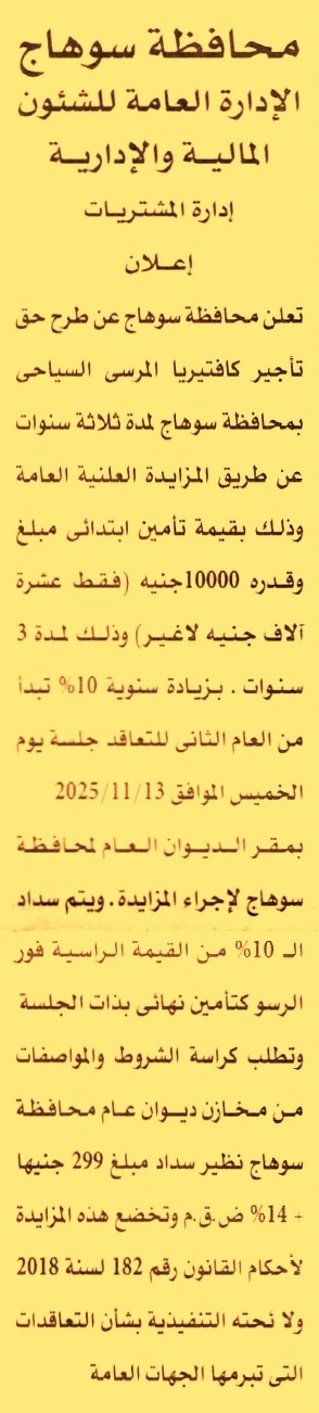 HOT Information مزايدة علنية عامة لعملية تأجير كافتيريا المرسى السياحي بمحافظة سوهاج لمدة 3 سنوات بزيادة 10% سنويا عن جريدة الأهرام Post navigation مستشفى سوهاج التعليمي وزارة الزراعة