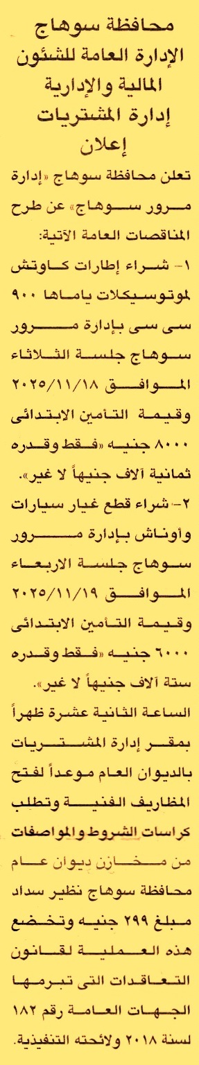HOT Information مناقصة عامة لعملية توريد إطارات كاوتش لموتوسيكلات ياماها 900 سي سي بإدارة مرور سوهاج عن جريدة الجمهورية Post navigation مركز شباب الرياح بالإسماعيلية رئاسة حي أول المحلة الكبرى