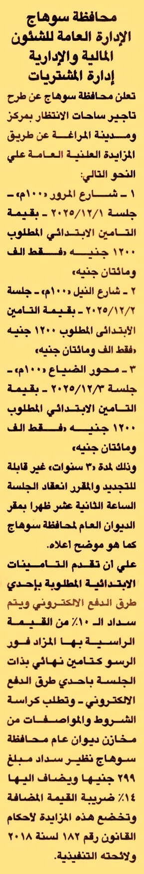 HOT Information مزايدة علنية عامة لعملية تأجير ساحات الانتظار بمركز ومدينة المراغة (1) شارع المرور 100م (2) شارع النيل 100م (3) محور الضياع 100م لمدة 3 سنوات غير قابلة للتجديد عن جريدة الجمهورية Post navigation الهيئة العامة لقصور الثقافة المركز القومي لبحوث الإسكان
