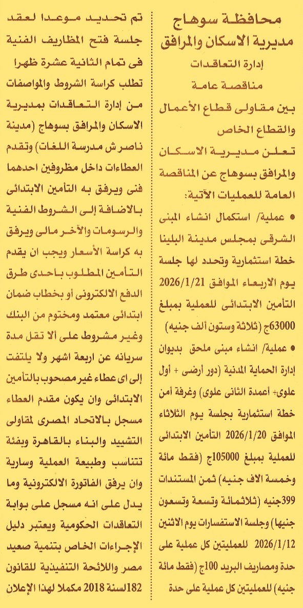 HOT Information مناقصة عامة لعملية استكمال إنشاء المبنى الشرقي بمجلس مدينة البلينا (جلسة الاستفسارات يوم 12/1/2026 ومدة سريان خطاب الضمان 4 أشهر) عن جريدة الأهرام Post navigation شركة السكر والصناعات التكاملية المصرية جمعية عطاء بلا حدود لتنمية المجتمع بمحافظة أسيوط