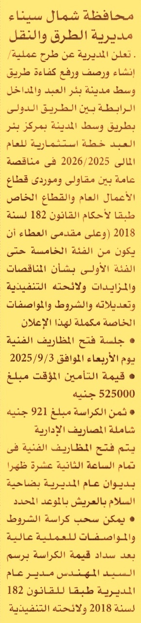 HOT Information مناقصة عامة لعملية إنشاء ورصف ورفع كفاءة طريق وسط مدينة بئر العبد والمداخل الرابطة بين الطريق الدولي بطريق وسط المدينة بمركز بئر العبد (فئة التصنيف من الخامسة حتى الأولى) عن جريدة الأهرام Post navigation الادارة العامة لمشروعات تطوير الري بوسط الدلتا رئاسة مركز ومدينة طنطا