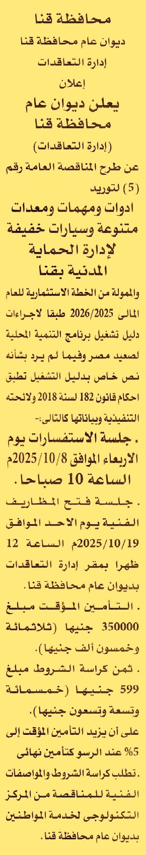 HOT information مناقصة عامة رقم 5/2025/2026 لعملية توريد أدوات ومهمات ومعدات متنوعة وسيارات خفيفة لإدارة الحماية المدنية بقنا (جلسة الاستفسارات يوم 8/10/2025 الساعة 10 ص) عن جريدة الأهرام Post navigation شركة مصر الوسطى لتوزيع الكهرباء مستشفيات جامعة المنصورة