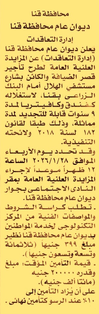 تأجير قصر الضيافة والكائن بشارع مستشفى الهلال أمام البنك الزراعي بقنا