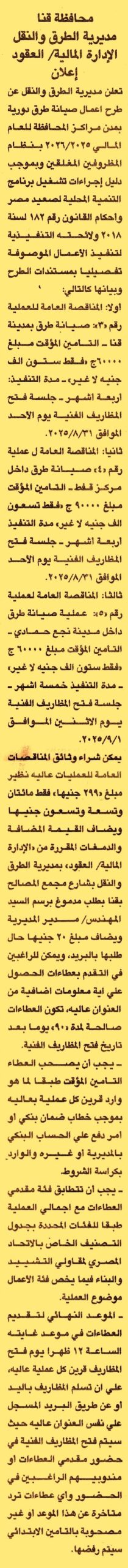 HOT Information مناقصة عامة رقم 3/2025/2026 لعملية صيانة طرق بمدينة قنا مدة تنفيذ العملية 4 أشهر (مدة سريان العطاءات 3 أشهر) عن جريدة الجمهورية Post navigation رشركة مطاحن ومخابز شمال القاهرة شركة الغازات البترولية