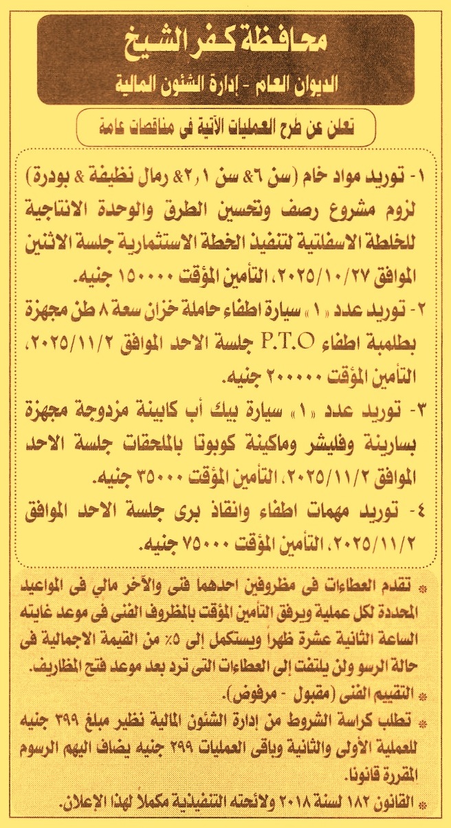 HOT Information مناقصة عامة لعملية توريد مواد خام “سن 6, سن 1 و2, رمال نظيفة, بودرة” لزوم مشروع رصف وتحسين الطرق والوحدة الإنتاجية للخلطة الأسفلتية لتنفيذ الخطة الاستثمارية عن جريدة الأخبار Post navigation شركة السكر والصناعات التكاملية المصرية نادي حلوان الرياضي