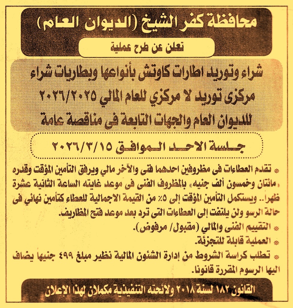 HOT information مناقصة عامة لعملية توريد إطارات كاوتش بأنواعها وبطاريات “شراء مركزي توريد لا مركزي” للعام المالي 2025/2026 (العملية قابلة للتجزئة) عن جريدة الأخبار Post navigation النقابة العامة للأطباء البيطريين المركز القومي لبحوث وتكنولوجيا الإشعاع