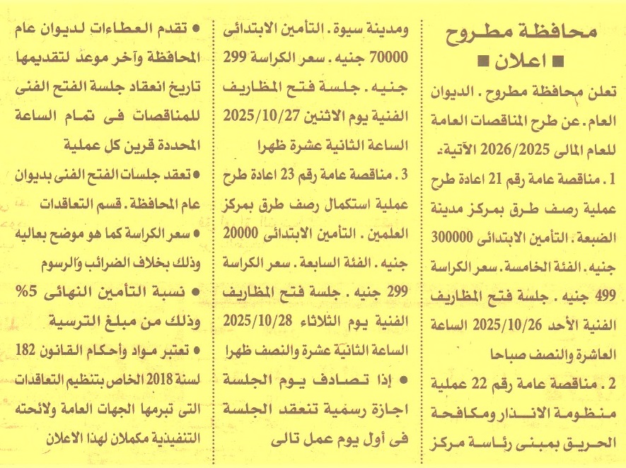 HOT Information إعادة مناقصة عامة رقم 21/2025/2026 لعملية رصف طرق بمركز مدينة الضبعة (فئة التصنيف الخامسة) عن جريدة الأهرام Post navigation الأزهر الشريف مديرية التربية والتعليم بمطروح
