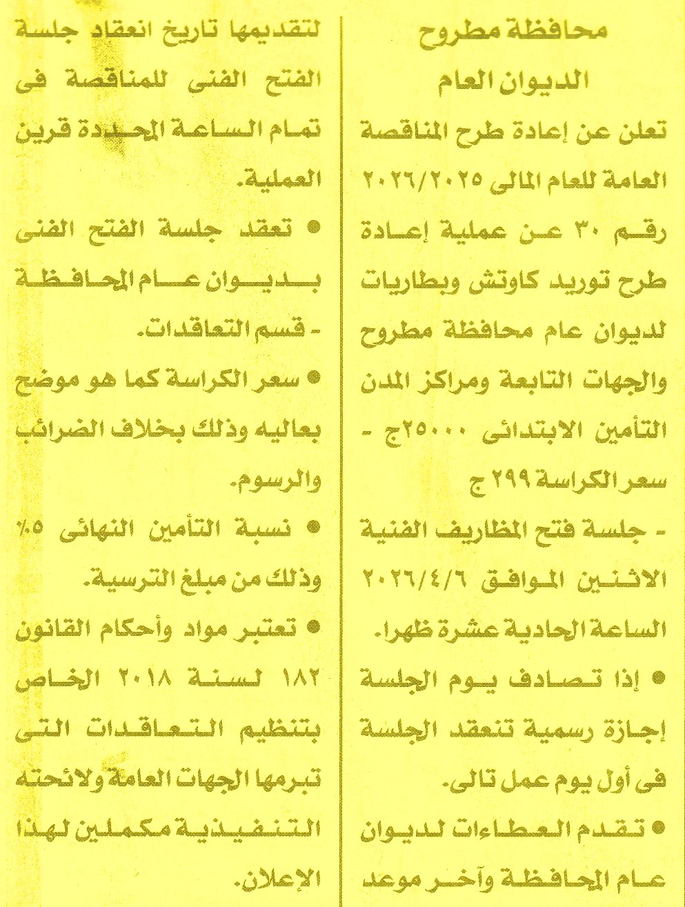HOT information إعادة طرح مناقصة عامة رقم 30/2025/2026 لعملية توريد كاوتش وبطاريات لديوان عام محافظة مطروح والجهات التابعة ومراكز المدن عن جريدة الأخبار Post navigation الوحدة المحلية لمركز ومدينة كفر الشيخ مستشفى جمال الدين الأفغاني