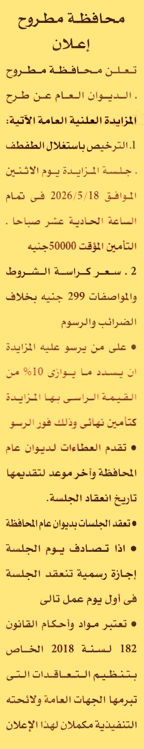 HOT Information مزايدة عامة لعملية حق الترخيص باستغلال الطفطف عن جريدة الأهرام Post navigation نادي الواسطى الجمعية الشرعية بالمعادي