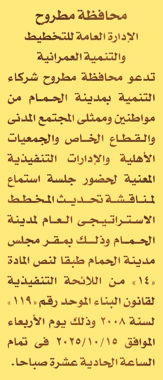 لحضور جلسة استماع لمناقشة تحديث المخطط الإستراتيجي العام لمدينة الحمام