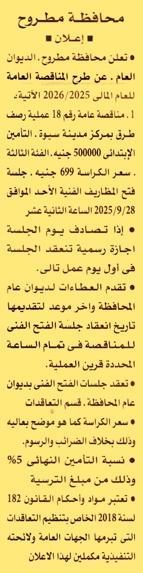 HOT Information مناقصة عامة رقم 18/2025/2026 لعملية رصف طرق بمركز مدينة سيوة (فئة التصنيف الثالثة) عن جريدة الأهرام Post navigation هيئة إنقاذ الطفولة – مكتب مصر الجامعة المصرية اليابانية للعلوم والتكنولوجيا ببرج العرب