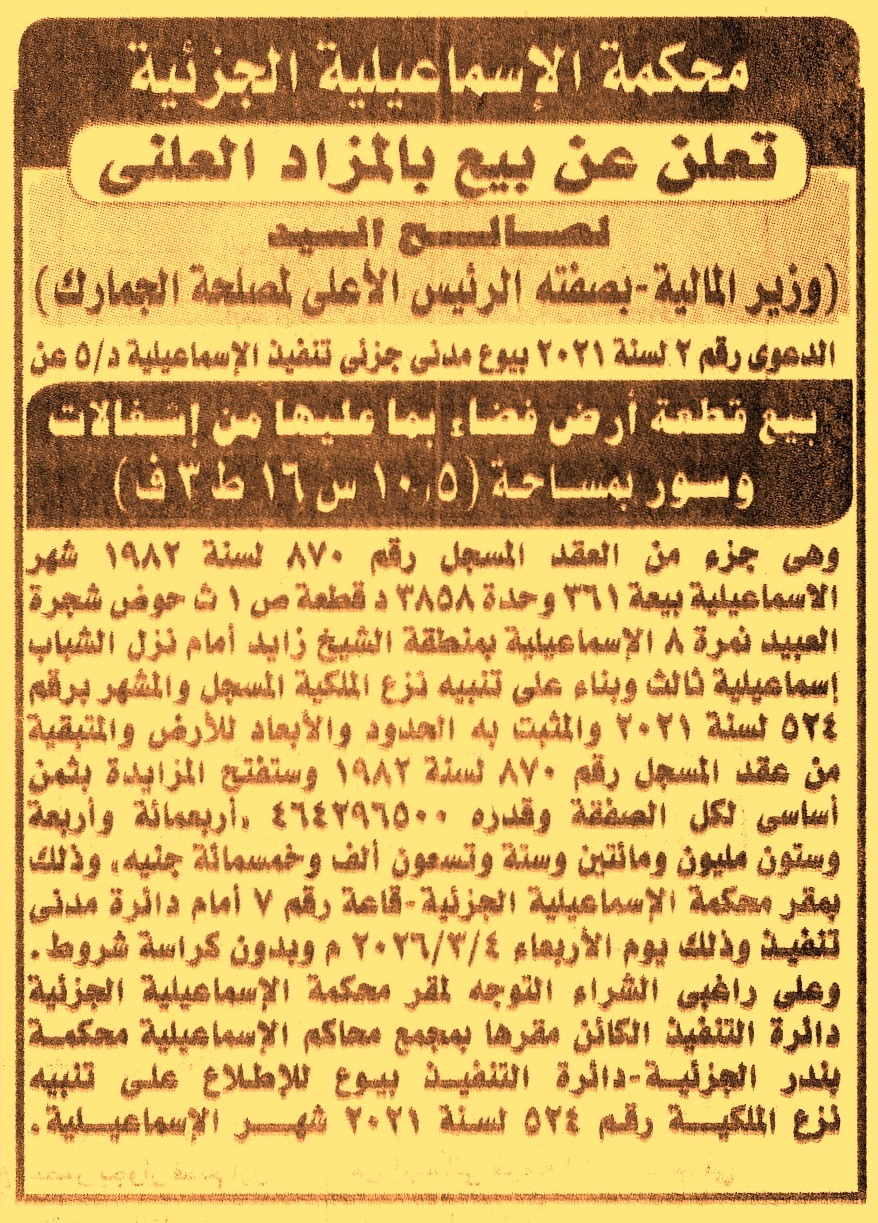 قطعة ص 1 ث حوض شجرة العبيد نمرة 8 – الإسماعيلية – منطقة الشيخ زايد – أمام نزل الشباب – إسماعيلية ثالث