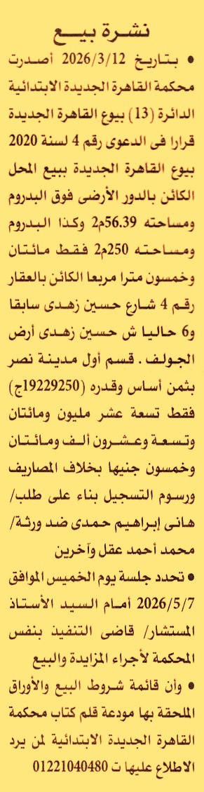 الكائن بالعقار رقم 4 شارع حسين زهدي سابقا و6 حاليا ش حسين زهدي – أرض الجولف – قسم أول مدينة نصر