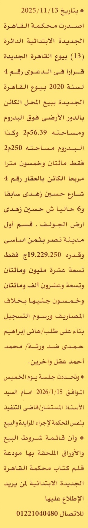 الكائن بالعقار رقم 4 شارع حسين زهدي سابقا و6 حاليا ش حسين زهدي – أرض الجولف – قسم أول مدينة نصر