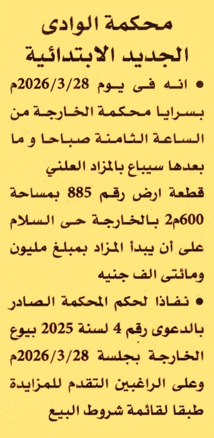 بيع قطعة أرض رقم 885 بمساحة 600م2 بالخارجة حي السلام
