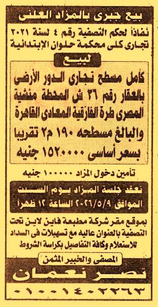بالعقار 36 شارع المحطة منشية المصري بطرة – الفاروقية – المعادي – القاهرة