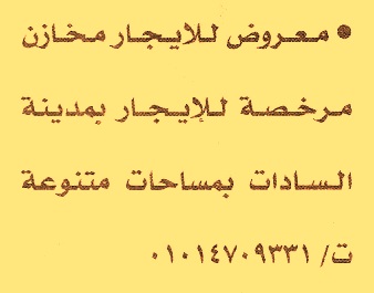 HOT Information مخازن مرخصة للإيجار بمدينة السادات بمساحات متنوعة ت: 01014709331 عن جريدة الأخبار Post navigation شركة مصر للطيران للخدمات الأرضية جمعية مسجد الصحابة بسوهاج