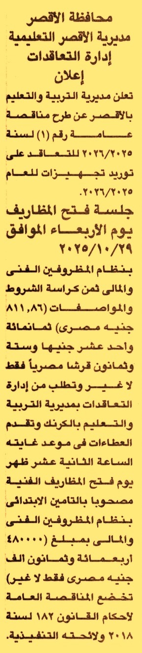 HOT Information مناقصة عامة رقم 1/2025/2026 لعملية توريد تجهيزات عن جريدة الجمهورية Post navigation محافظة المنوفية البنك المركزي المصري