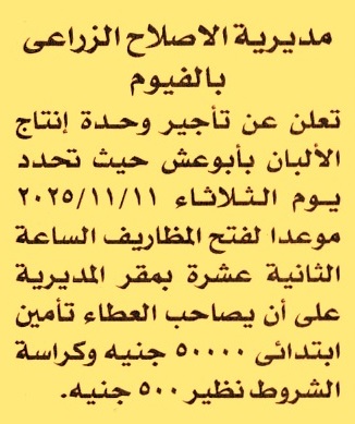 HOT Information مزايدة عامة لعملية تأجير وحدة إنتاج الألبان بأبو عش عن جريدة الأخبار Post navigation الهيئة العامة للتأمين الصحي فرع كفر الشيخ مركز شباب برك الخيام