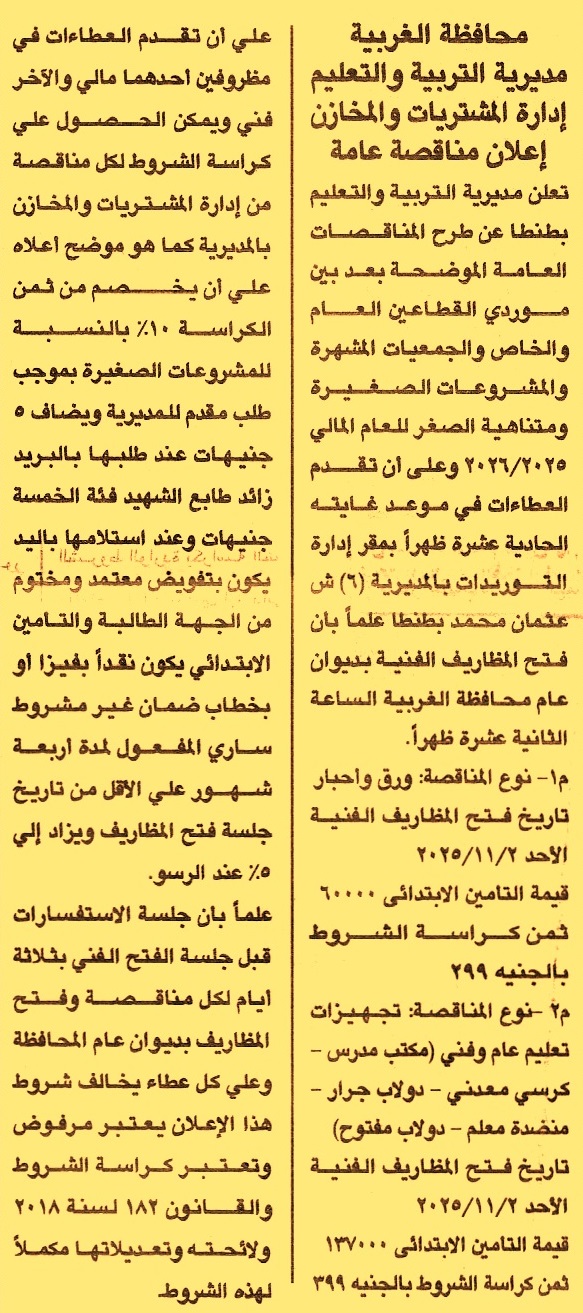 HOT Information مناقصة عامة لعملية توريد ورق وأحبار (تباع الكراسة بخصم 10% للمشروعات الصغيرة ومدة سريان خطاب الضمان 4 أشهر وجلسة الاستفسارات قبل جلسة الفتح الفني بـ 3 أيام) عن جريدة الجمهويرة Post navigation شركة مياه الشرب والصرف الصحي بالمنيا مركز تنمية شبابية الصف