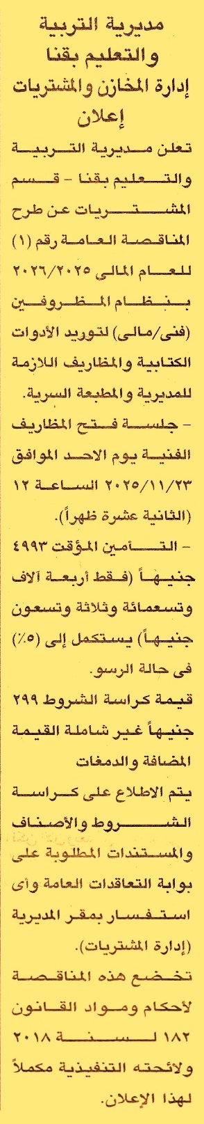 HOT information مناقصة عامة رقم 1/2025/2026 لعملية توريد الأدوات الكتابية والمظاريف اللازمة للمديرية والمطبعة السرية عن جريدة الجمهورية Post navigation مركز تنمية شبابية الصفا جامعة الأزهر