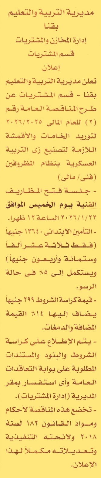HOT information مناقصة عامة رقم 2/2025/2026 لعملية توريد الخامات والأقمشة اللازمة لتصنيع زي التربية العسكرية عن جريدة الأخبار Post navigation وزارة الزراعة الشركة القابضة لمصر للطيران