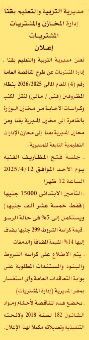 HOT Information مناقصة عامة رقم 4/2025/2026 لعملية نقل الكتب وكراسات الإجابات من مخازن الوزارة بالقاهرة إلى مخازن المديرية بقنا ومن مخازن المديرية بقنا إلى مخازن الإدارات التعليمية التابعة للمديرية عن جريدة الأهرام Post navigation الشركة المصرية لإدارة وتشغيل المترو الوحدة المحلية لمركز ومدينة كفر الشيخ