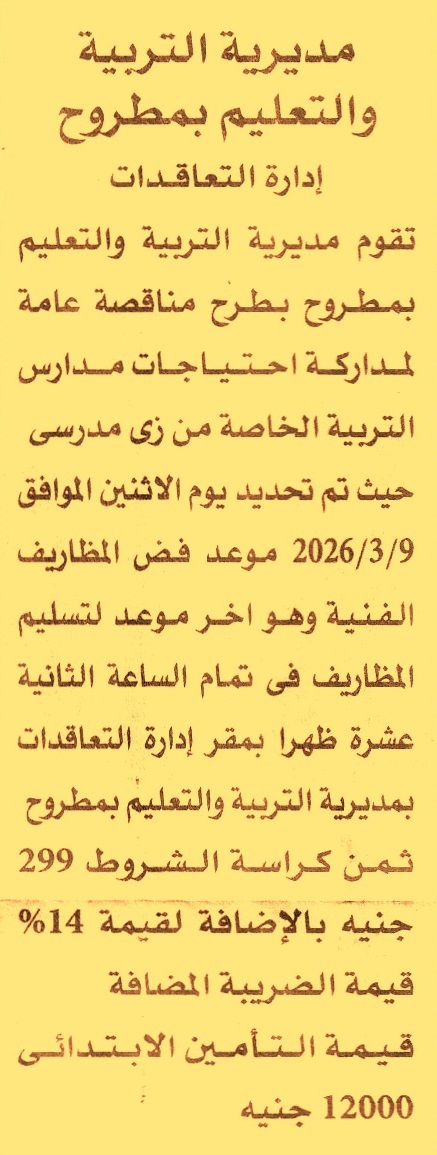 HOT Information مناقصة عامة لعملية مداركة احتياجات مدارس التربية الخاصة من زي مدرسي عن جريدة الأهرام Post navigation الإدارة العامة لصرف شمال الدقهلية شركة سيناء للمنجنيز