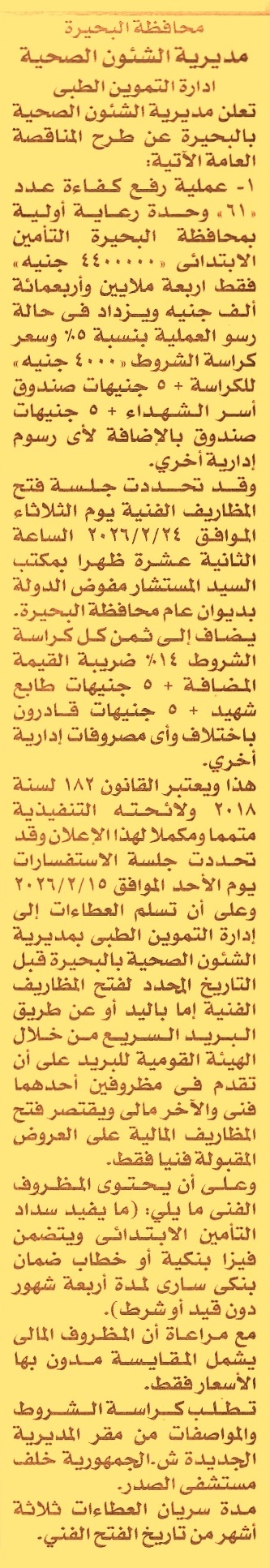 HOT Information مناقصة عامة لعملية رفع كفاءة عدد 61 وحدة رعاية أولية بالمحافظة (جلسة الاستفسارات يوم 15/2/2026 ومدة سريان خطاب الضمان 4 أشهر ومدة سريان العطاءات 3 أشهر) عن جريدة الأخبار Post navigation مؤسسة أخبار اليوم مركز شباب أريمون بكفر الشيخ