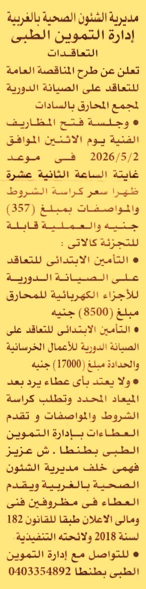 HOT information مناقصة عامة لعملية تنفيذ أعمال الصيانة الدورية لمجمع المحارق بالسادات (1) الصيانة الدورية للأجزاء الكهربائية للمحارق (2) الصيانة الدورية للأعمال الخرسانية والحدادة عن جريدة الأهرام Post navigation شركة شمال القاهرة لتوزيع الكهرباء المعهد التذكاري للأبحاث الرمدية