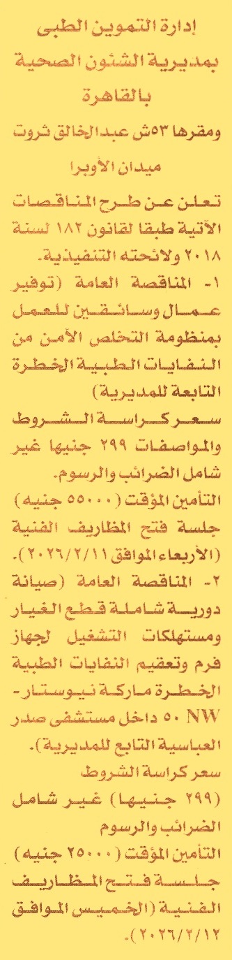 HOT Information مناقصة عامة لعملية توفير عمال وسائقين للعمل بمنظومة التخلص الأمن من النفايات الطبية الخطرة التابعة للمديرية عن جريدة الأخبار Post navigation شركة الغازات البترولية شركة مياه الشرب والصرف الصحي بأسوان