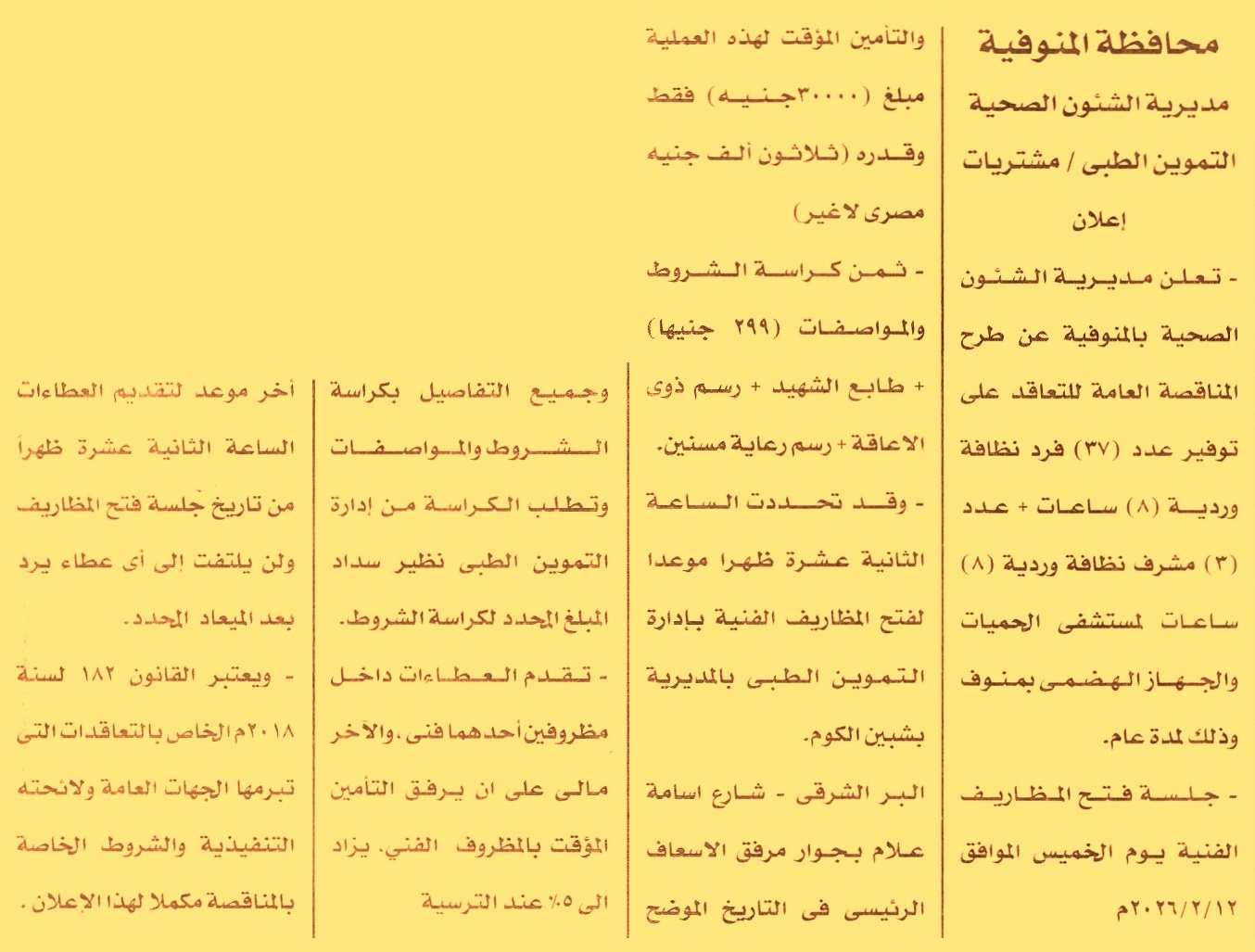 HOT Information مناقصة عامة لعملية توفير عدد 37 فرد نظافة وردية 8 ساعات وعدد 3 مشرف نظافة وردية 8 ساعات لمستشفى الحميات والجهاز الهضمي بمنوف لمدة عام عن جريدة الأخبار Post navigation الهيئة العامة للتنمية الصناعية الهيئة العامة للرقابة على الصادرات والواردات