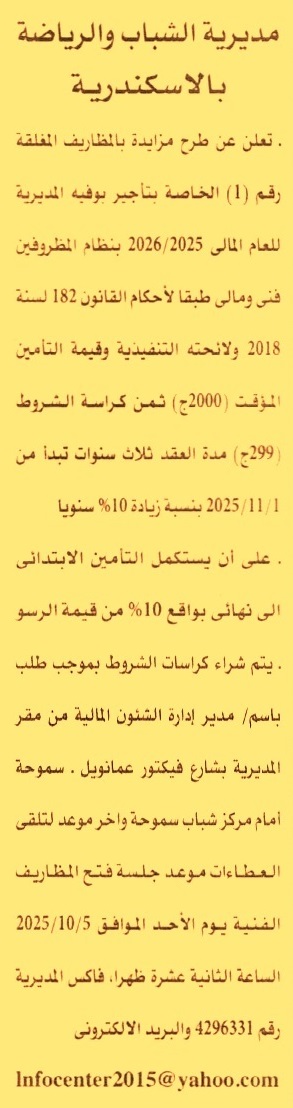 HOT Information مزايدة عامة رقم 1/2025/2026 لعملية تأجير بوفيه المديرية لمدة 3 سنوات تبدأ من 1/11/2025 بزيادة 10% سنويا عن جريدة الأهرام Post navigation شركة الصرف الصحي بالإسكندرية جمعية المبرات الخيرية الإسلامية