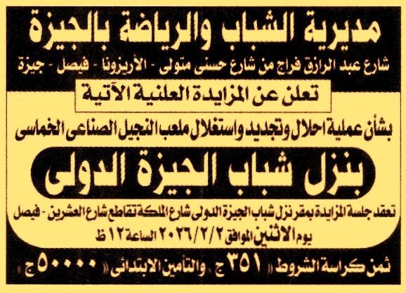 إحلال وتجديد واستغلال ملعب النجيل الصناعي الخماسي بنزل شباب الجيزة الدولي