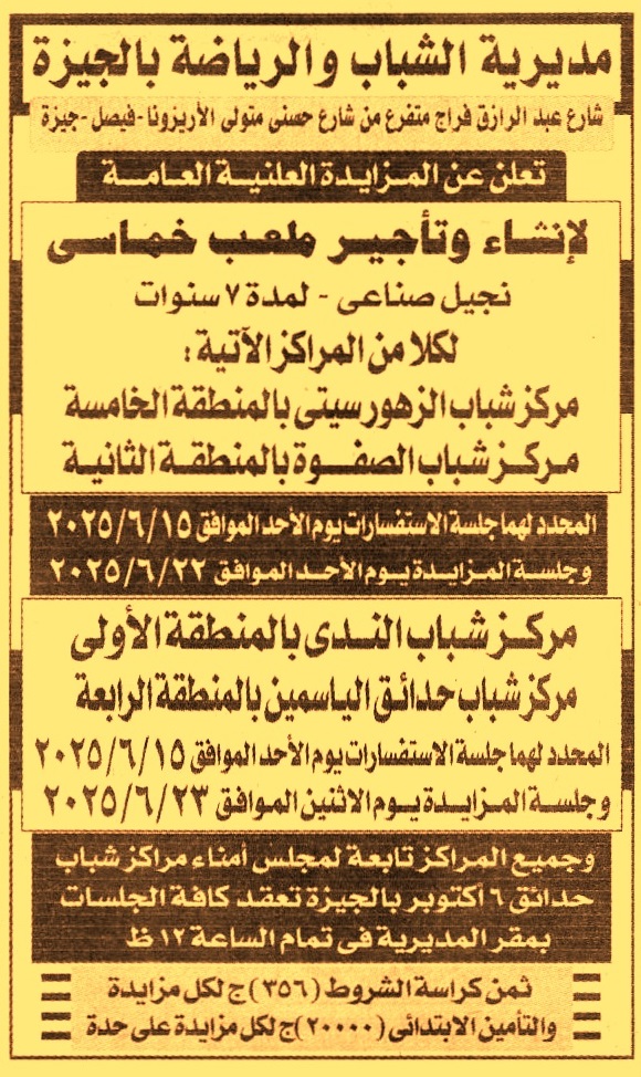 HOT Information مزايدة علنية عامة لعملية إنشاء وتأجيل ملعب خماسي نجيل صناعي لمدة 7 سنوات لكل من المراكز الأتية (1) مركز شباب الزهور سيتي بالمنطقة الخامسة (2) مركز شباب الصفوة بالمنطقة الثانية (جلسة الاستفسارات يوم 15/6/2025) عن جريدة الجمهورية Post navigation مركز شباب عرب أبو ختيرش وزارة الشباب والرياضة