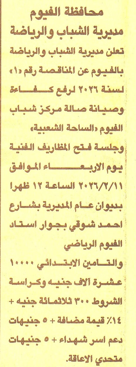 HOT information مناقصة رقم 1 لسنة 2026 لعملية رفع كفاءة وصيانة صالة مركز شباب الفيوم (الساحة الشعبية) عن جريدة الجمهورية Post navigation مركز التنمية الشبابية مدينة بني سويف الجديدة وحدة تحسين الإنتاج النباتي والحيواني