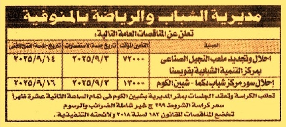 HOT Information مناقصة عامة لعملية إحلال وتجديد ملعب النجيل الصناعي بمركز التنمية الشبابية بقويسنا (جلسة الاستفسارات يوم 3/9/2025) عن جريدة الجمهورية Post navigation المجلس الوطني للإعتماد الشركة العامة للصوامع والتخزين