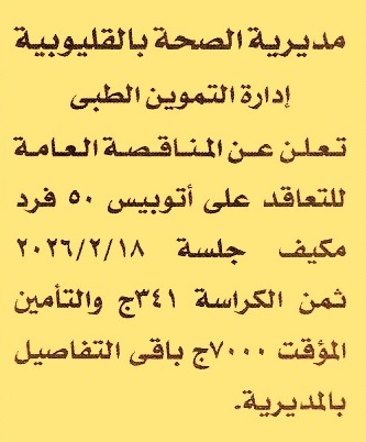 HOT Information مناقصة عامة لعملية توريد أتوبيس 50 فرد مكيف عن جريدة الأخبار Post navigation محافظة الفيوم الهيئة العامة للتأمين الصحي