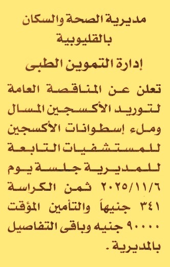 HOT information مناقصة عامة لعملية توريد الأكسجين المسال وملء إسطوانات الأكسجين للمستشفيات التابعة للمديرية عن جريدة الأخبار Post navigation الهيئة القومية لسكك حديد مصر الهيئة القومية لسكك حديد مصر