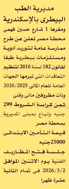 HOT Information مناقصة عامة لعملية توريد أدوية ومستلزمات بيطرية عن جريدة الأهرام Post navigation مجلس مدينة الأقصر الهيئة العامة للتنمية الصناعية