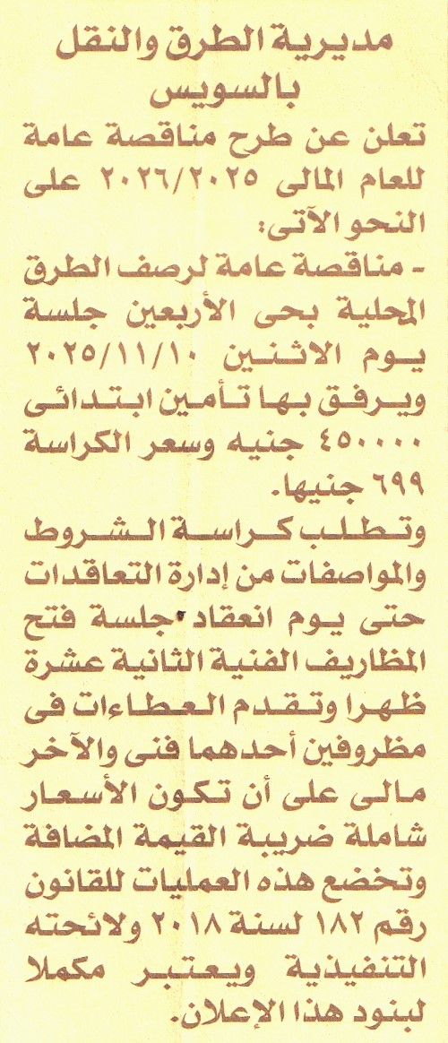 HOT information مناقصة عامة لعملية رصف الطرق المحلية بحي الأربعين عن جريدة الأخبار Post navigation جمعية الشباب الوطني للإسكان التعاوني الوكيل العقاري أ / عزة الوكيل