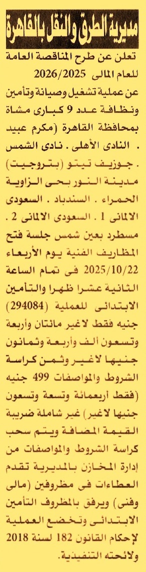 تشغيل وصيانة وتأمين ونظافة عدد 9 كباري مشاة بمحافظة القاهرة