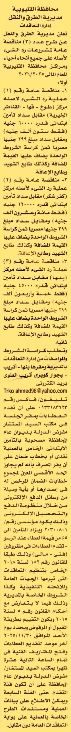 HOT Information مناقصة عامة رقم 1/2025/2026 لعملية تنفيذ أعمال رد الشيء لأصله مركز “طوخ, قها, القناطر الخيرية” (فئة التصنيف السابعة) عن جريدة الأخبار Post navigation شركة مصر لصناعة الكيماويات وزارة الموارد المائية والري