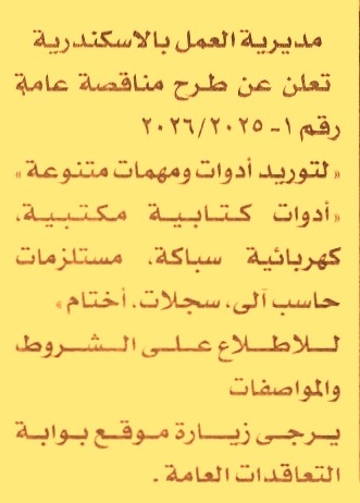HOT Information مناقصة عامة رقم 1/2025/2026 لعملية توريد أدوات ومهمات متنوعة “أدوات كتابية ومكتبية – كهربائية – سباكة – مستلزمات حاسب ألي – سجلات – أختام” عن جريدة الأخبار Post navigation مدرسة كلية البنات القومية شركة النوبارية لصناعة وتكرير السكر